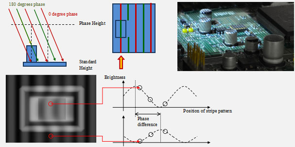 SAKI在線在線AOI自動(dòng)光學(xué)檢測儀BF-3Di使用多組條紋光系統(tǒng).通過投射寬窄模式的黑白條紋光,可以穩(wěn)定地精確測量出各種類型元件的高度信息.例如:0402mm元件,黑色的IC本體,以及鏡面材質(zhì)的元件.