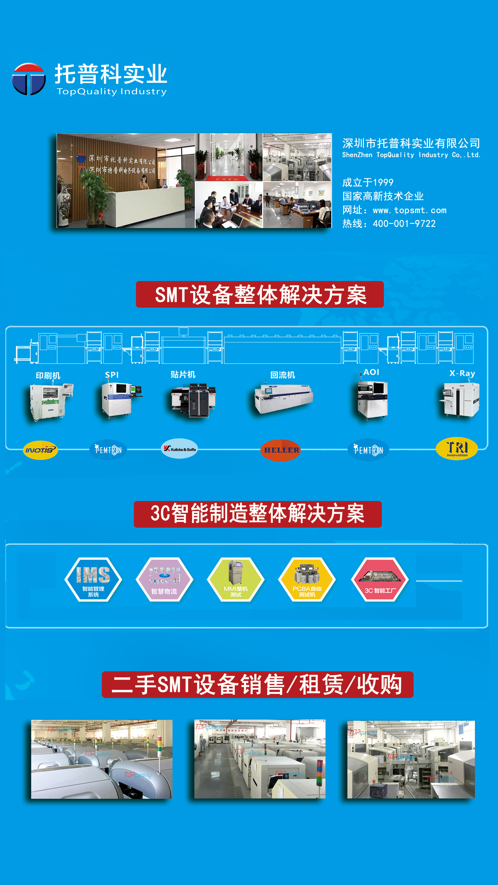 深圳市托普科實業有限公司是一家高科技術公司,專業提供二手及全新SMT設備,(貼片機,回流焊,波峰焊,印刷機,AOI,SPI)收銷/租賃/維修以及SMT周邊所有設備研發、生產,銷售為一體,產品有:(上板機、下板機、接駁臺、平行移載機、雙軌機、跌板機、真空吸板機、緩存機、NG/OK收板機、印刷機、及各類工業控制系統開發,配件銷售)提供一站式SMT貼裝解決方案。